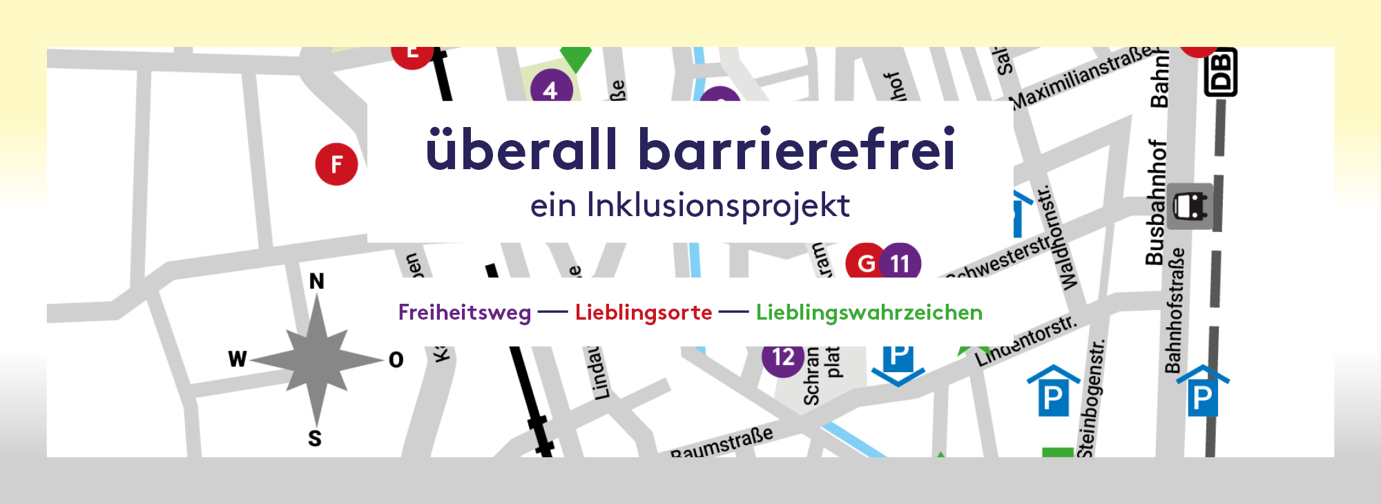 In dem Flyer zur Aktion „überall barrierefrei“ sind alle Lieblingswahrzeichen, Lieblingsorte und die 12 Stationen des Freiheitswegs eingezeichnet. Auch der Flyer ist in einfacher Sprache geschrieben. Das hilft Menschen mit Behinderungen, Menschen, die nicht gut sehen oder nicht gut lesen können und auch Menschen aus anderen Ländern, z.B. Touristen, Memmingen und die Memminger Freiheitsgeschichte zu erkunden.