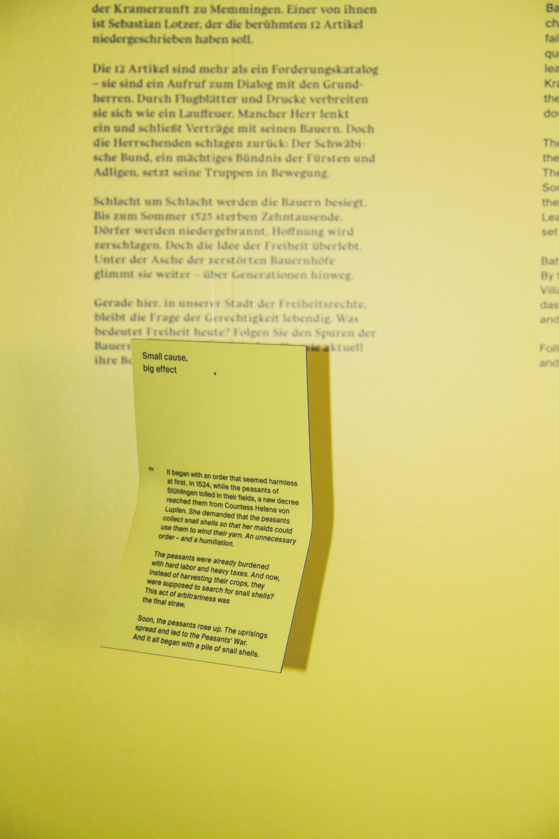 Nach dem großen Gedenkjahr 1525 und dem sehr erfolgreichen Courage-Projekt "Spuren des Bauernkriegs" bleibt der „12 Artikel-Weg“ nun dauerhaft im Stadtmuseum zugänglich und lädt Besucherinnen und Besucher dazu ein, die Wurzeln der Freiheitsrechte und der Bauernkriegsgeschichte auf eigene Faust zu entdecken. Erkunden Sie die spannenden Hintergründe der 12 Artikel - der Forderungskatalog von 1525 - einer der ersten Formulierungen von Menschen- und Freiheitsrechten in Europa.